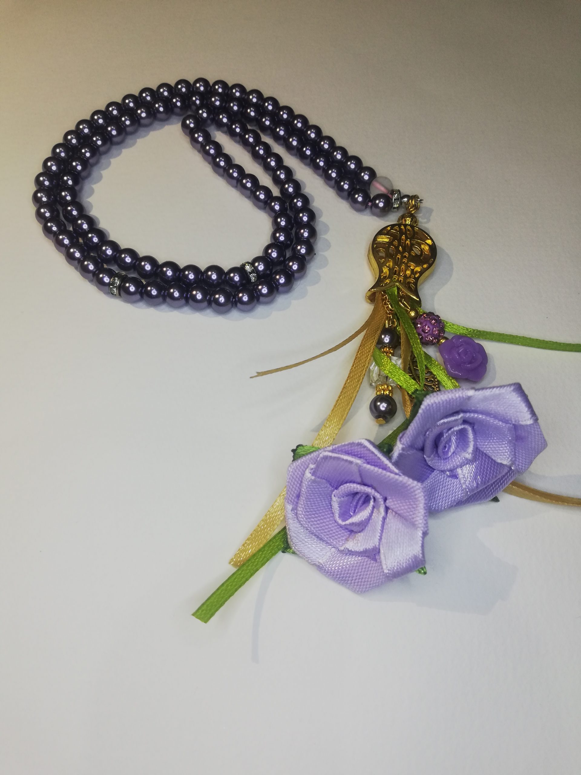 تسبیح 100 تایی با آویز لاله استیل و دو عدد گل رز و مروارید سنگی یاسی سایز 6 ساخته شده